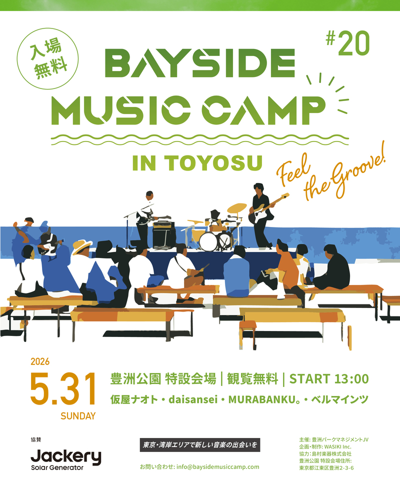 BAYSIDE MUSIC CAMP IN TOYOSU #20 SCHEDULE 2026/05/31(日) 13:00 - 豊洲公園 特設会場 地図を表示 START 13:00 仮屋ナオト / MURABANKU。 / daisansei / ベルマインツ 開催名:BAYSIDE MUSIC CAMP IN TOYOSU #20会場:豊洲公園特設会場時間:13:00 START 観覧無料 URLをコピーする 報告する